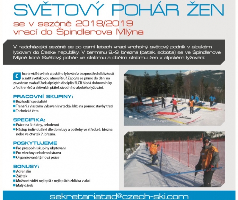 Česká republika bude po dlouhých osmi letech znovu hostit vrcholný podnik v alpském lyžování. V termínu 8. a 9. března 2019 se do Špindlerova Mlýna vrátí Světový pohár ve slalomu a obřím slalomu žen. Chcete být přímo u toho? Staňte se dobrovolníkem a podílejte se na organizaci velkolepé lyžařské akce na našem území.