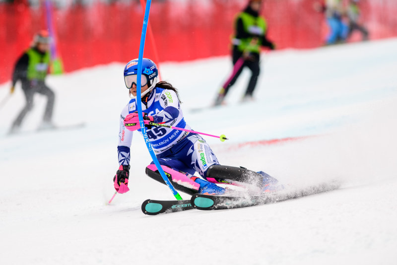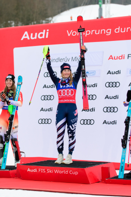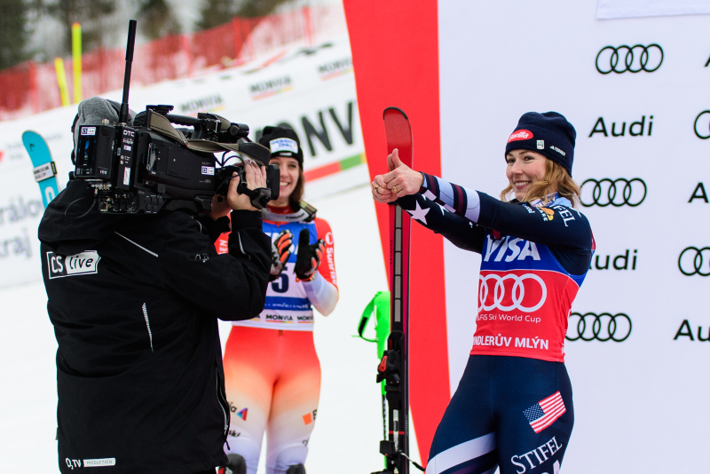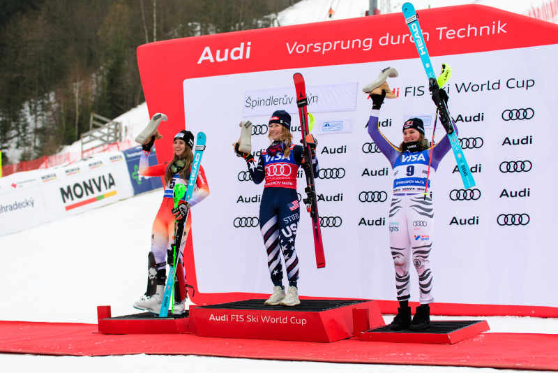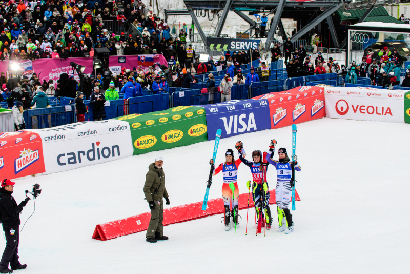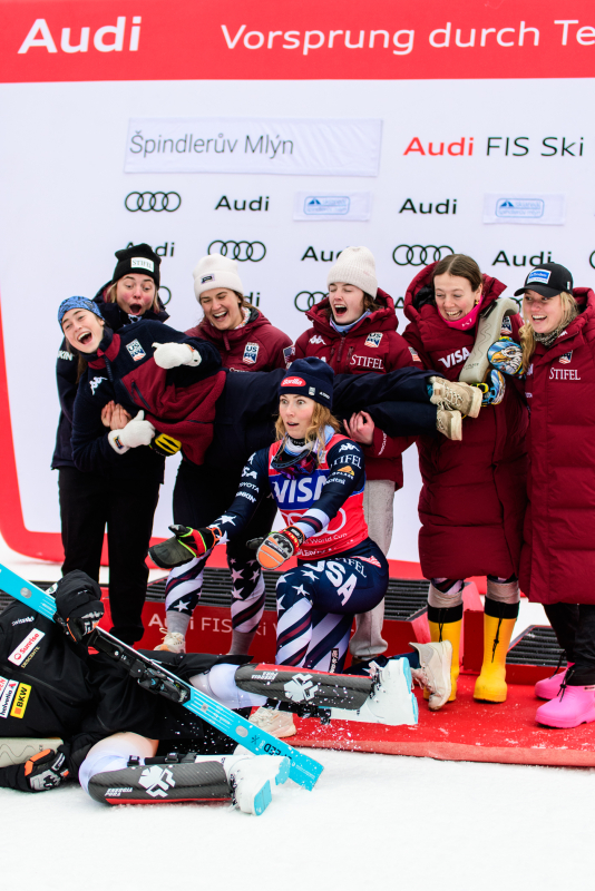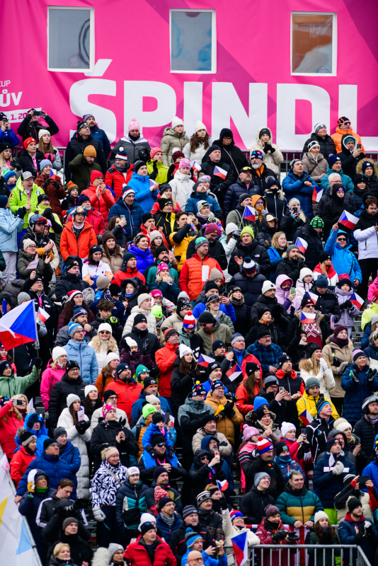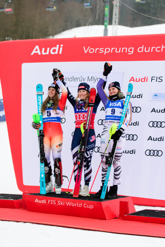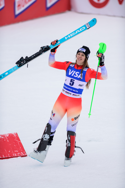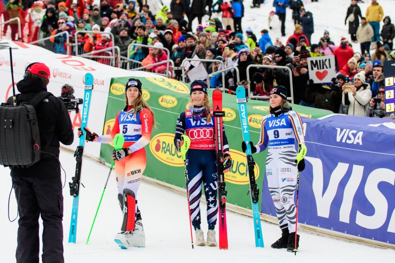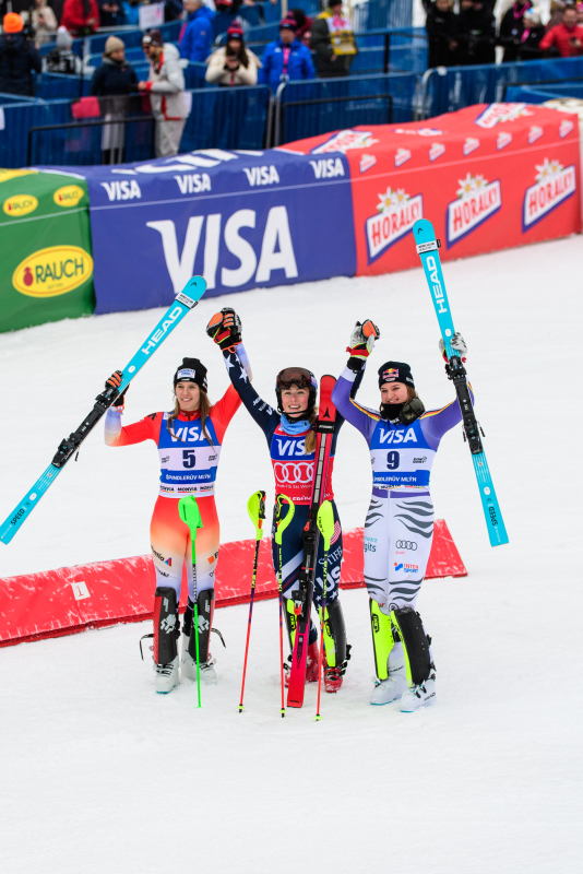 Špindlerův Mlýn byl v neděli svědkem historického okamžiku. V úžasné atmosféře ovládla slalom Američanka Mikaela Shiffrinová a stala se první ženou v dějinách, která získala devět malých křišťálových glóbů. Na stupních vítězů jí sekundovaly Švýcarka Camille Rastová a Němka Emma Aicherová. Domácí publikum potěšil výkon Martiny Dubovské, která prolomila prokletí letošní sezony a brala body za povedenou 21. příčku. Foto: Josef Štěpán