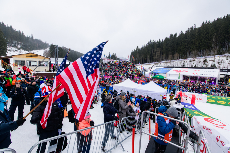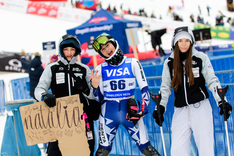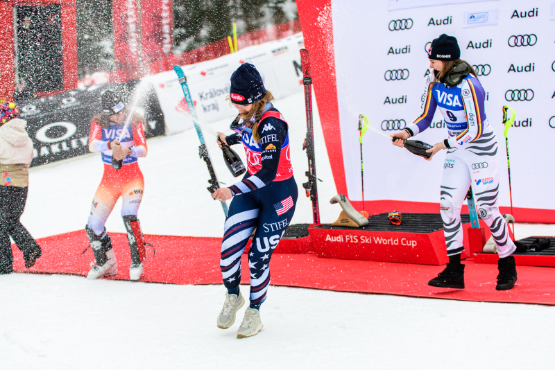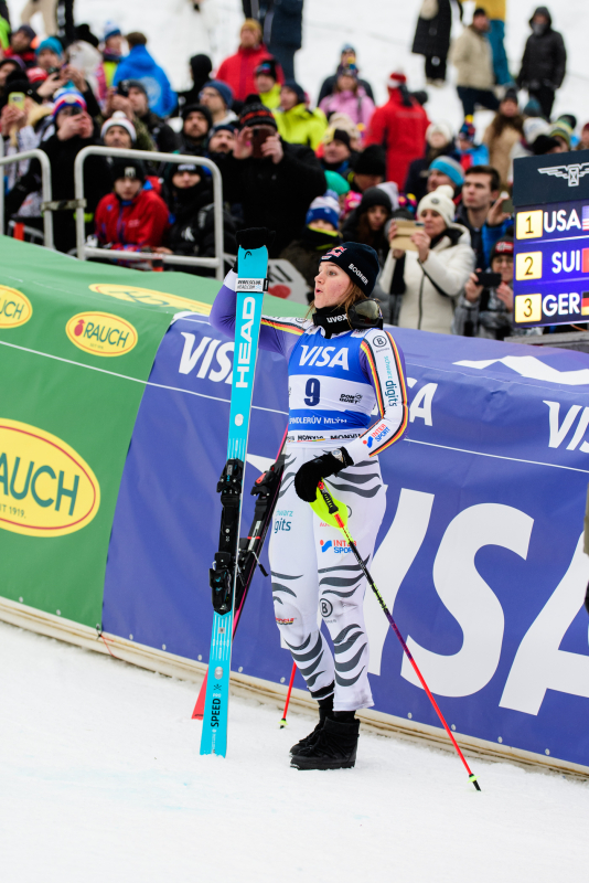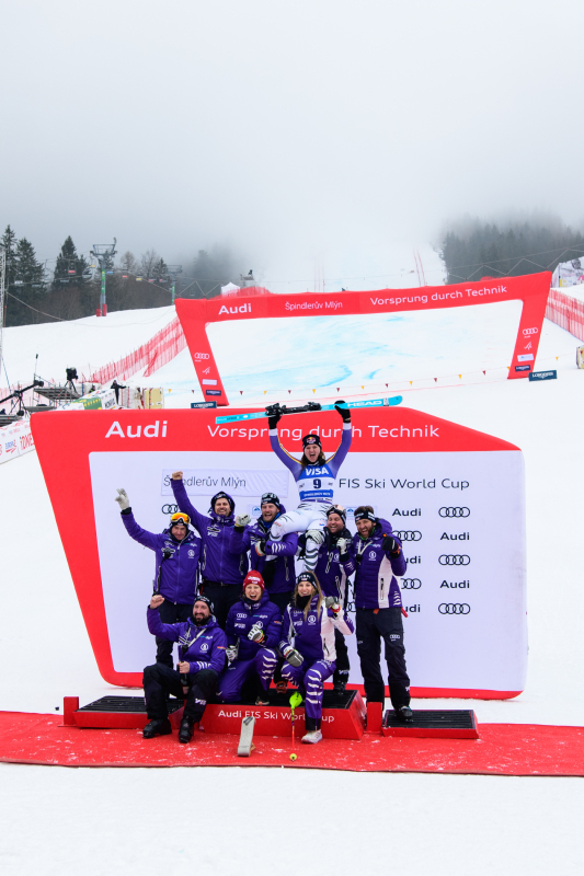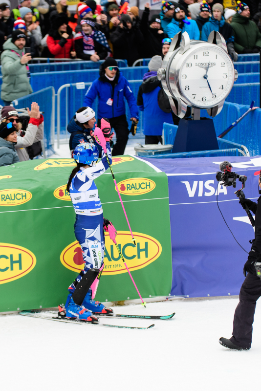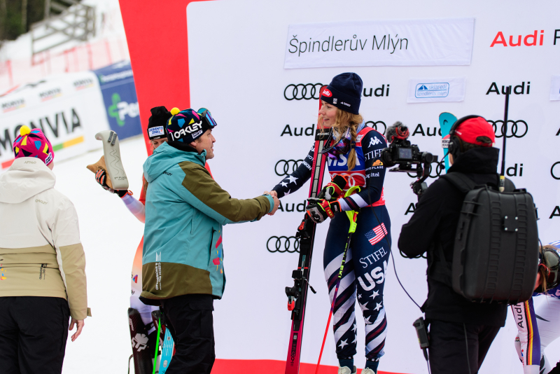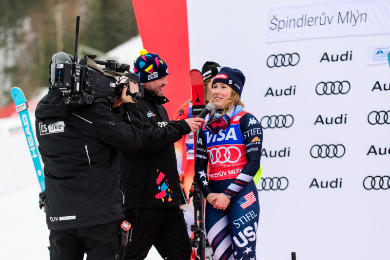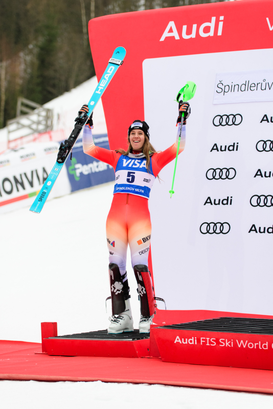 Špindlerův Mlýn byl v neděli svědkem historického okamžiku. V úžasné atmosféře ovládla slalom Američanka Mikaela Shiffrinová a stala se první ženou v dějinách, která získala devět malých křišťálových glóbů. Na stupních vítězů jí sekundovaly Švýcarka Camille Rastová a Němka Emma Aicherová. Domácí publikum potěšil výkon Martiny Dubovské, která prolomila prokletí letošní sezony a brala body za povedenou 21. příčku. Foto: Josef Štěpán