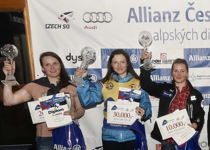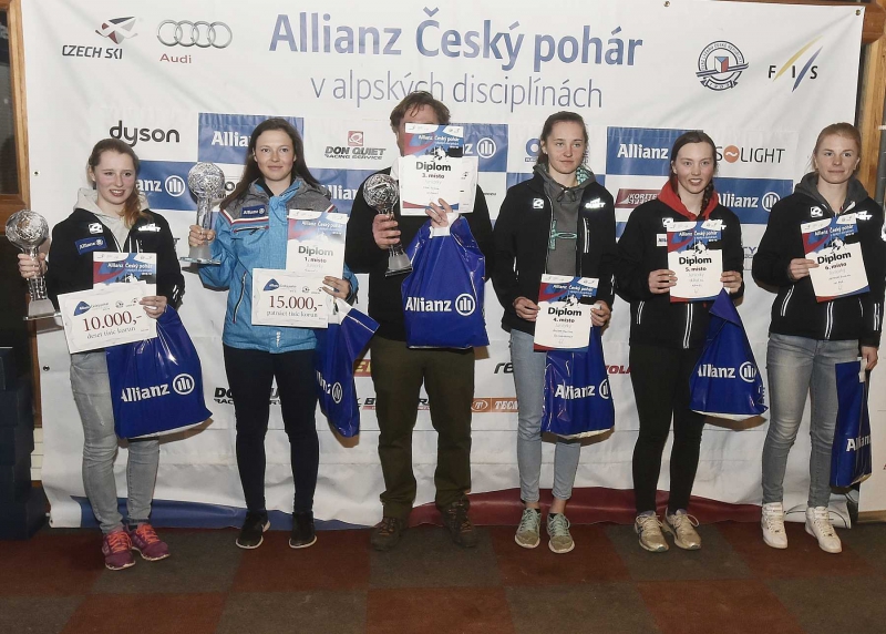 Stříbrná Karolína Kloučková „Spokojená jsem. Před sezónou jsme si řekli, že bychom Allianz ČP chtěli odjet celý a podle toho jsme se i skladbou závodů řídili. Jezdím v klubu, ve kterém ČP mladším zatím ne tolik silným závodníkům pomáhá. V rámci ČP se mi povedlo zvítězit ve slalomu v Albrechticích, obřák se mi sice letos ani jednou nepodařilo vyhrát, ale s celkovým 2. místem jsem spokojená. Možná jsem chvíli pomýšlela i na vítězství, ale v průběhu sezóny jsem si zranila nohu (prasklina na hlavičce lýtkové kosti). V době mé rekonvalescence byla sice v ČP pauza, ale závěr sezóny už kvůli toho zranění nebyl úplně podle mých představ,“ zhodnotila své výsledky v Allianz ČP 2016 Karolína.
