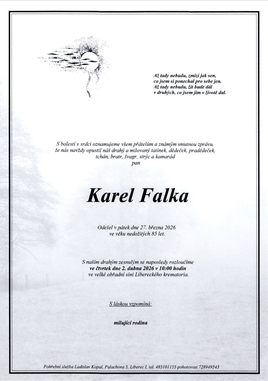 S lítostí oznamujeme, že v pátek 27. 3. 2026 nás opustil ve věku nedožitých 85 let pan Karel Falka, dlouholetý hlavní rozhodčí běžeckého lyžování, člen TJ Dukla Liberec. Skromný a poctivý člověk s opravdovým lyžařským srdcem. Čest jeho památce. Nikdy nezapomeneme! Pohřeb Karla Falky se uskuteční ve čtvrtek 2. dubna 2026 od 10 hodin v obřadní síni Libereckého krematoria.
