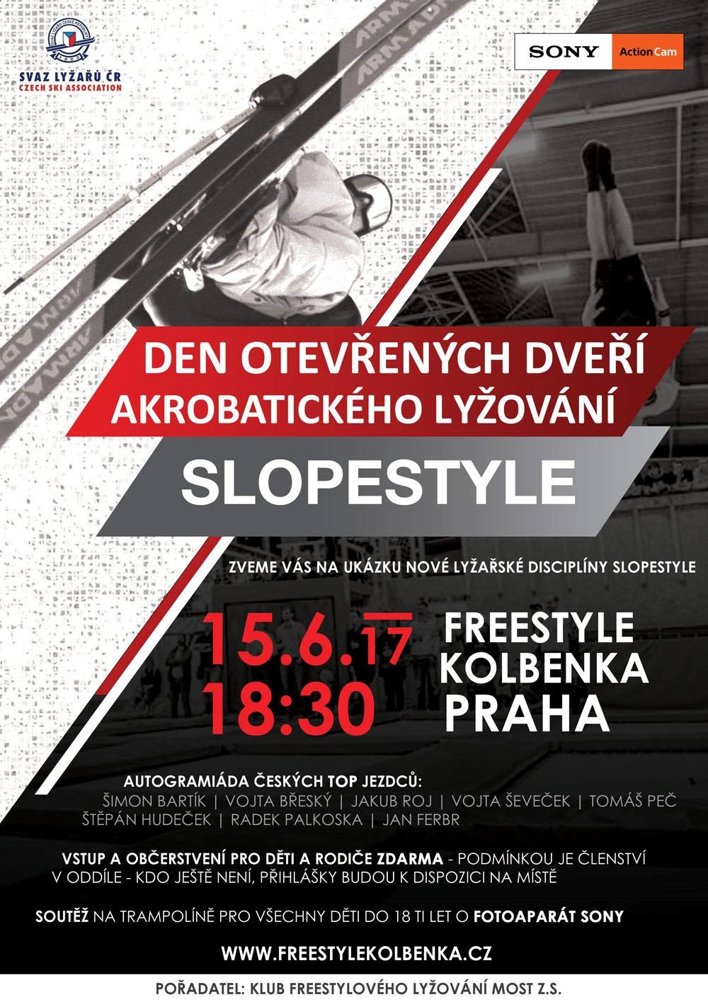 Zveme Vás na den otevřených dveří disciplíny Slopestyle! 15.6.2017 ve Freestyle Kolbenka Praha! Navíc soutěž o fotoaparát SONY. Tak doražte!