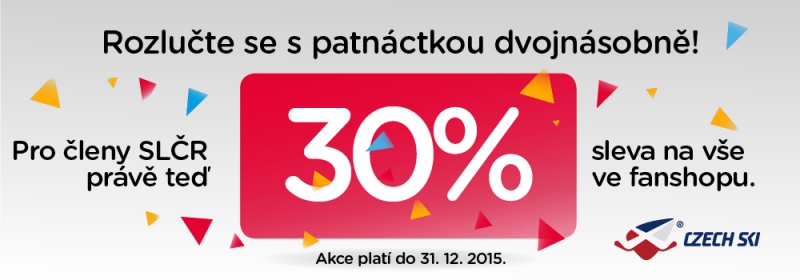 Svaz lyžařů ČR pro všechny své členy nachystal jeden speciální dárek! Od druhého svátku vánočního až do Silvestra můžete nakupovat veškerý sortiment oficiálního fanshopu SLČR se slevou 30%! Rozlučte se s rokem 2015 ve stylu.