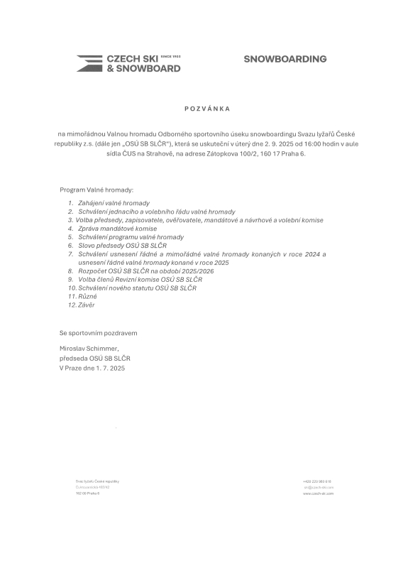 Pozvánka na mimořádnou Valnou hromadu Odborného sportovního úseku snowboardingu Svazu lyžařů České republiky z.s. (dále jen „OSÚ SB SLČR“), která se uskuteční v úterý dne 2. 9. 2025 od 16:00 hodin v aule sídla ČUS na Strahově, na adrese Zátopkova 100/2, 160 17 Praha 6. V případě zájmu jsou podklady pro Valnou hromadu 9/2025 k dispozici k nahlédnutí v sídle SLČR po předchozí domluvě se sekretářkou OSÚ SNB SLČR.