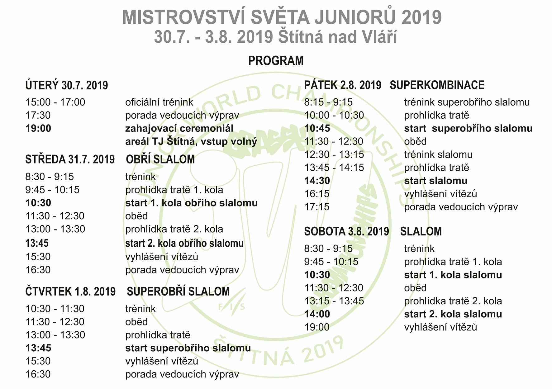 Program FIS Juniorské mistrovství světa v travním lyžování 2019: